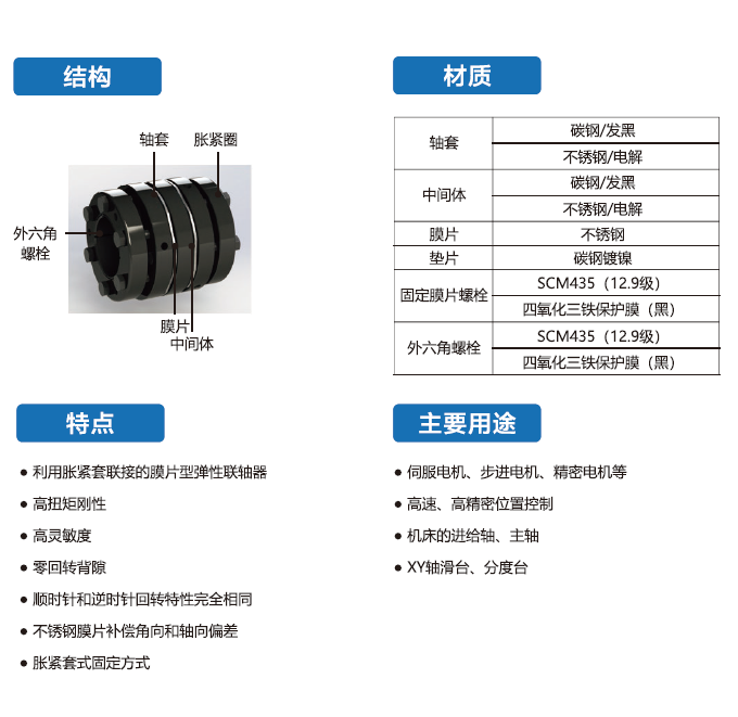 HSFPS-T系列聯(lián)軸器采用碳鋼發(fā)黑,利用脹緊套聯(lián)接的膜片型彈性聯(lián)軸器,廣泛用于伺服電機(jī)、步進(jìn)電機(jī)、精密電機(jī)等。