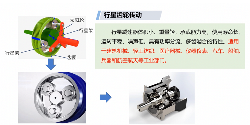 行星減速機(jī),其包括:行星輪、太陽輪和外齒圈。行星減速器體積小、重量輕,承載能力高,使用壽命長、運(yùn)轉(zhuǎn)平穩(wěn),噪聲低。具有功率分流、多齒嚙合的特性。適用于建筑機(jī)械、輕工紡織、醫(yī)療器械、儀器儀表、汽車、船舶和航空航天等領(lǐng)域。
