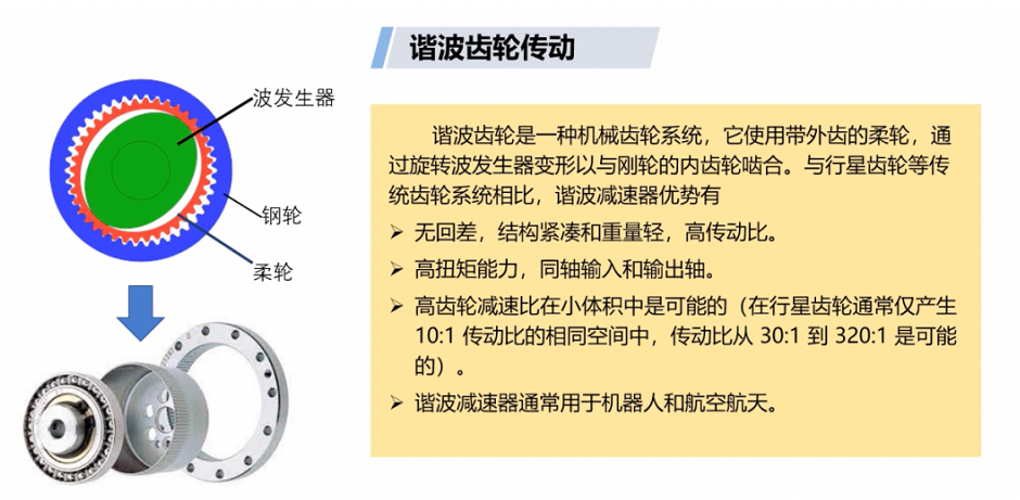諧波減速機(jī),其通過具有柔性的薄壁外齒齒輪產(chǎn)生彈性變形后與剛性的內(nèi)齒輪進(jìn)行內(nèi)嚙合來實(shí)現(xiàn)傳動的。它由剛輪、柔輪,波發(fā)生器三大傳動元件組成。諧波減速機(jī)傳動比大,無回差,結(jié)構(gòu)緊湊和重量輕,高精度等優(yōu)點(diǎn)在機(jī)器人及自動化技術(shù)領(lǐng)域發(fā)揮舉足輕重的作用,我國自1980年開始進(jìn)行諧波減速器標(biāo)準(zhǔn)化和系列化;1985年制定了中小功率通用諧波減速器系列標(biāo)準(zhǔn),成為世界第四個擁有通用諧波減速標(biāo)準(zhǔn)的國家。