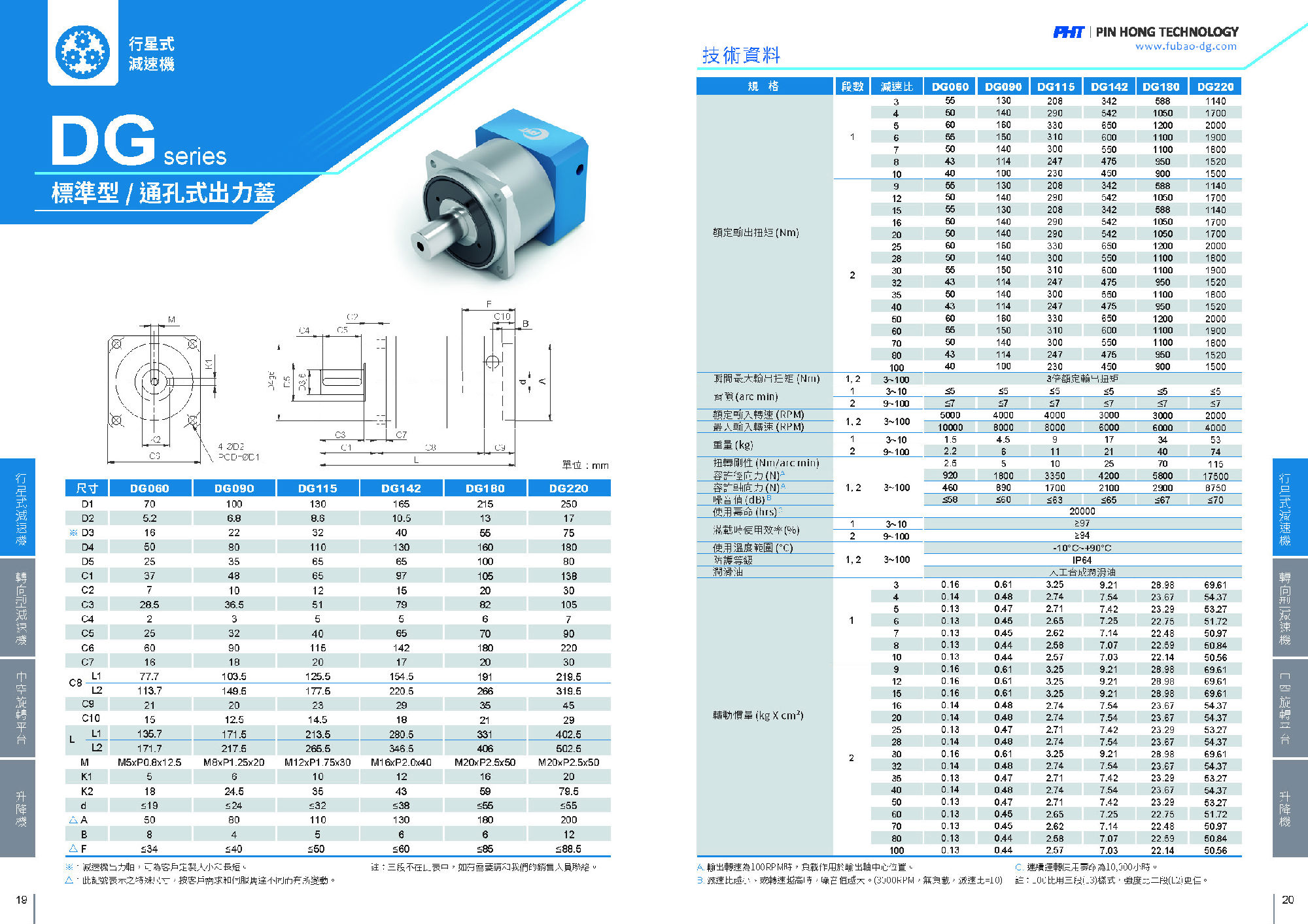 DG系列是標準型高精度減速機。 適合精度定位之需求,齒輪采用合金鋼材,外部搭配通孔式出力蓋。 品宏減速機的軸承是用NSK品牌的,齒輪經過碳化,故精度和剛性都比較優越!減速機出力軸是可根據客戶的要求去定制大小和長短的。