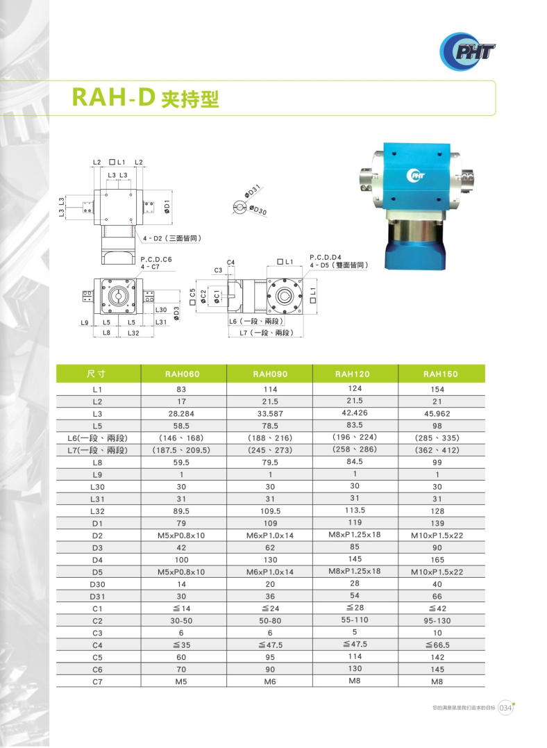RAH-D系列是夾持型設(shè)計(jì)。 鋁合金材質(zhì)可提高散熱能力,減緩溫升現(xiàn)象造成影響。 多樣化的出力軸可因應(yīng)各種場合,客制化的入力端可搭配各式馬達(dá)。 提供各式特色之減速機(jī),供使用者依需求選購。 特殊油封設(shè)計(jì),正常使用下不需保養(yǎng)亦不用更換潤滑油,可延長使用壽命。 各式特色,體積小,省空間,噪音低,輸出扭矩高,安裝容易,可搭配馬達(dá)型號廣泛。 RAH搭配DM,一體成型的齒輪組,可有效的減低噪音。 RAH搭配DH,最佳的性價(jià)比,可廣泛應(yīng)用于各種場合。