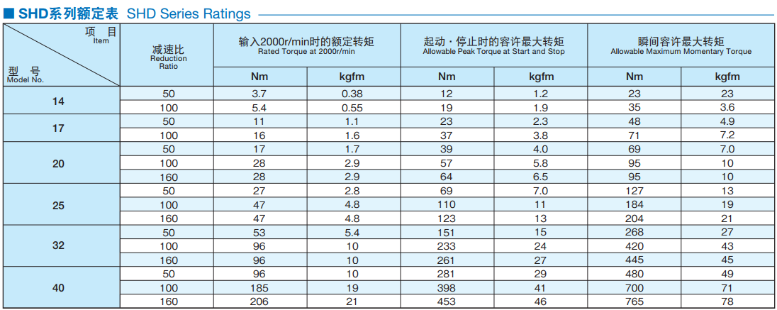SHD系列是在輸出側組裝了力矩剛性較強的交叉滾子,軸承的簡易組合型,共6種型號,形成了系列。有組合和簡易組合可供選擇,進一步提升設計的自由度。 諧波發生器:橢圓形凸輪的外圈上嵌入薄型的滾珠軸承,整體呈一橢圓形狀的零件。軸承的內圈固定于凸輪之上,外圈則介由滾珠彈性變形。一般安裝在輸入軸上。 柔輪:具有薄壁杯型的金屬彈性體的零件。杯的開口部外圈刻有齒形。柔輪的底部稱為膜,通常安裝到輸出軸上。 剛輪:剛性環狀的零件。內側上刻有與柔輪同樣大小的齒形,且比柔輪多2個齒數。一般固定在外殼上。
