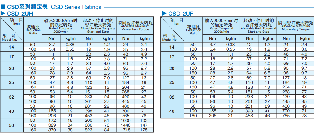 新型Harmonic Drive CSD系列順應市場要求實現了大膽創新的小型化。 CSD-2UH體積比轉矩容量相同的CSF系列更小。 CSD-2UF為中空結構,輸出側軸承的負載容量是SHD系列同型號的約2倍。 諧波發生器:橢圓形凸輪的外圈上嵌入薄型的滾珠軸承,整體呈一橢圓形狀的零件。軸承的內圈固定于凸輪之上,外圈則介由滾珠彈性變形。一般安裝在輸入軸上。 柔輪:具有薄壁杯型的金屬彈性體的零件。杯的開口部外圈刻有齒形。柔輪的底部稱為膜,通常安裝到輸出軸上。 剛輪:剛性環狀的零件。內側上刻有與柔輪同樣大小的齒形,且比柔輪多2個齒數。一般固定在外殼上。
