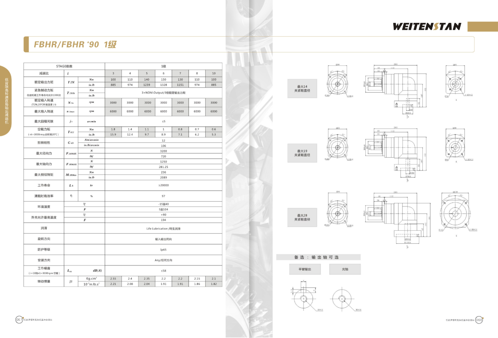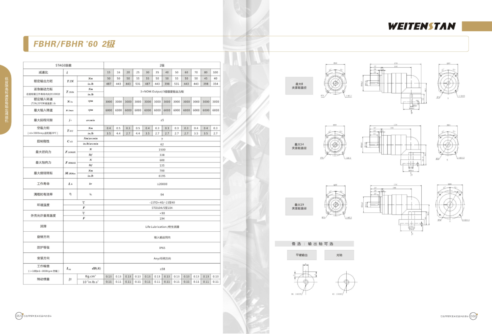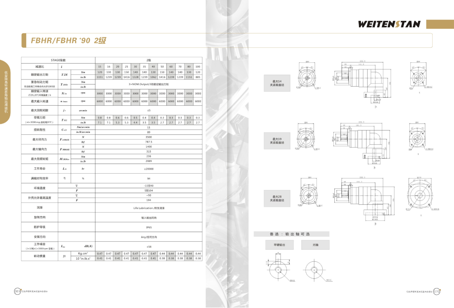 FBHR系列低背隙高轉速直角輸出減速機。 FBHR產品系列的轉角式減速機,標準規格的轉角輸出適用于高精度高轉速的連續工作。 極高的功率密度。盡管以往系列性能極為出色,但我們成功的將扭矩提高了近40%。不斷提高極限值,典型威騰斯坦產品! 電機安裝簡易。電機可安全簡易的一步安裝,另外您也可以選擇威騰斯坦享有的專利權的,帶有長度補償軸的安裝。 任意位置安裝。不管你在哪個位置安裝,你的齒輪箱始終有相同的潤滑油/潤滑脂量。安裝靈活、齒輪箱能夠垂直、水平、與從動軸一起向上或向下安裝。 極高的定位精度。根據用戶需求,你可獲得回程間隙小于角分的高型行星齒輪箱。這也大大提高了你應用上的定位精度。 通過齒輪嚙合,運轉平穩。相比直齒嚙合齒輪箱,本公司的斜齒嚙合齒輪箱運轉噪音減低了50dB-A,你深知50dB-A所創造的價值遠遠高于70dB-A。此外還有:不再感動振動,運轉平穩到令人驚訝。 世界水平的預期壽命。原材料進行了優化,幾何形狀同樣進行了優化。